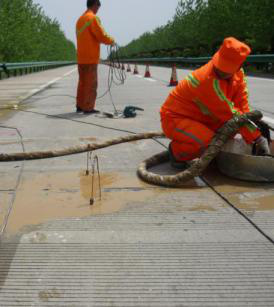 基于落錘式彎沉儀(FWD)檢測結(jié)果,向脫空板底部注射高聚物材料,材料發(fā)生化學(xué)反應(yīng)后體積迅速膨脹并固化,從而快速填充脫空、排除積水并加固路基。起到預(yù)防混凝土板塊斷裂,延長混凝土板塊使用壽命的作用。